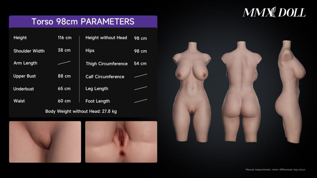 MMX Doll 98cm torso with Meng Ting head features voluptuous curves, lifelike breasts and hips, soft touch, and compact design for immersive realism.